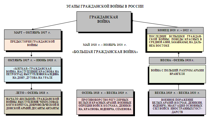 Основные этапы Гражданской войны. Итак, Гражданская война в России имела место с 1917 по 1922 г. Ее масштабы, состав участников, формы борьбы позволяют в данных временных рамках выделить следующие основные этапы.
