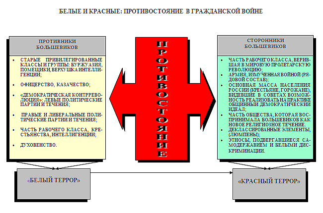 Противостояние на данном этапе носило классовый характер. Хотя агитация политических партий и оказывала свое воздействие, но нельзя отрицать объективную социальную первооснову: солдаты против офицеров и генералов, рабочие против владельцев фабрик и заводов, крестьяне против помещиков. Революцию совершил народ: рабочие Петрограда и солдаты ˗ в большинстве своем крестьяне, одетые в солдатские шинели. Однако их привели к революции объективные причины: копившаяся долгие годы неудовлетворенность своим положением; бесправие и насилие, переполнившие чашу народного терпения; сильное стремление к созданию нового общества, в котором хозяевами были бы люди труда, а не прежние властители. Таким образом, первопричина Гражданской войны – в строе и социальной несправедливости, существовавших в тот период в России.