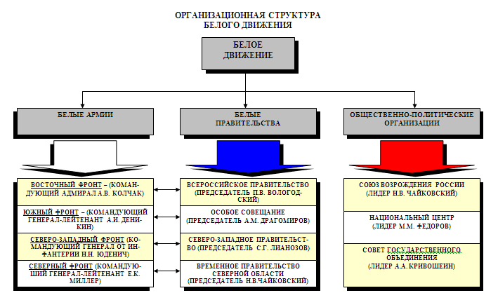 Организационно названное движение включало в себя собственно вооруженные силы и общественно-политические организации, поддерживавшие белую идею. Из их взаимодействия сложилась система власти на территориях, находившихся под управлением белых правительств. С лета 1918 г. схема организации власти белых представляла собой следующее: диктатор, объединявший в себе высшую исполнительную и законодательную власть, и совещательный орган при нем. На местах ее представителем являлся Главноначальствующий, на которого замыкались как действовавшие в зоне его ответственности командиры частей, так и местные губернаторы.