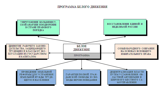 Белое движение достигло максимального размаха на протяжении лета 1918–1919 гг. Его политическая программавключала: ликвидацию власти большевиков; восстановление единой и неделимой России; созыв Народного собрания на основах всеобщего избирательного права; децентрализацию власти путем установления областной автономии и широкого местного самоуправления; гарантии гражданской свободы и свободы вероисповедания; проведение земельной реформы для устранения земельной нужды трудящегося населения.