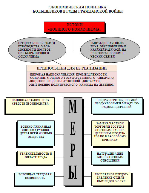 Развернувшая широкомасштабная война потребовала от большевиков со второй половины 1918 г. осуществить ряд чрезвычайных мер, направленных на централизацию государственного управления всеми сферами экономической жизни. Комплекс этих мер получил название «военный коммунизм». Главными при этом были: национализация всех средств производства, внедрение централизованного управления, уравнительное распределение продуктов, принудительный труд.
