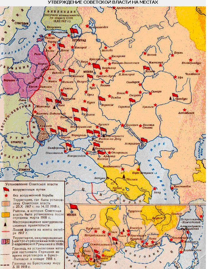 В сложившейся ситуации большевикам и их союзникам пришлось приложить немалые усилия для того, чтобы подавить перечисленные очаги сопротивления. В декабре 1917 г. была организована Всероссийская чрезвычайная комиссия по борьбе с контрреволюцией, спекуляцией и саботажем (ВЧК). 15 января 1918 г. был принят Декрет о создании Красной Армии, а 29 января – о создании Красного Флота, комплектуемых на добровольных началах. Основой Рабоче-Крестьянской Красной Армии (РККА) стали отряды рабочей милиции и Красной Гвардии, а также некоторые части прежней армии, которые сохранили боеспособность и сочувствие революции. Несмотря на разнородность элементов, вошедших в ее первоначальный состав, Красная Армия, опираясь на поддержку населения, имея численное превосходство, сумела подавить очаги антибольшевистского сопротивления. Таким образом установление советской власти, потребовавшее примерно 3–4 месяца, сопровождалось ожесточенной борьбой, нагнетанием ненависти, дальнейшей эскалацией насилия.