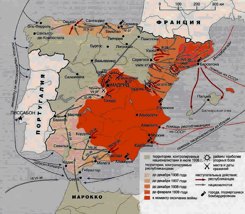 В Испании после революции 1931 г., ликвидировавшей монархию, шла острая борьба. Левые силы победили на выборах в кортесы в 1936 г. Правые силы во главе с генералом Франко организовали военный переворот. В стране началась гражданская война.
